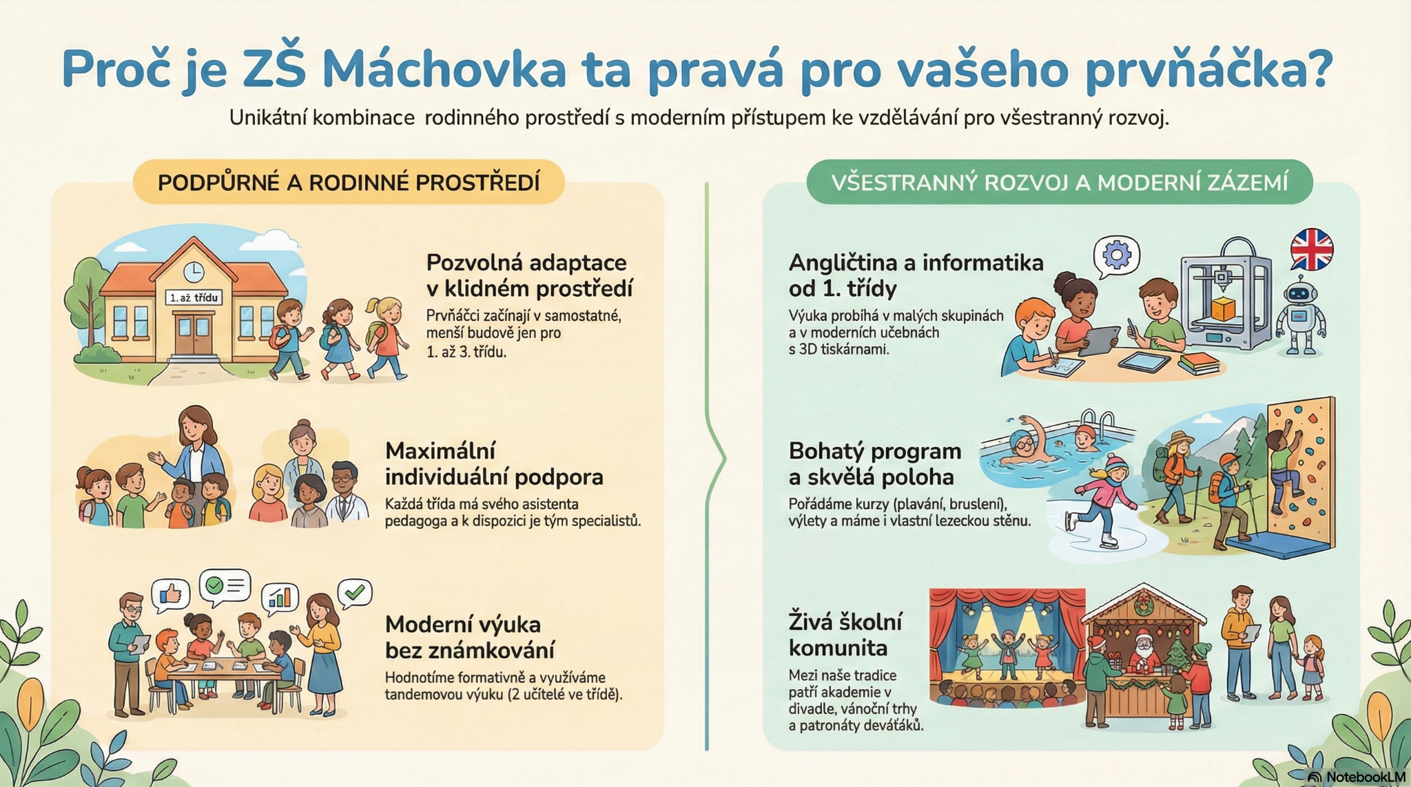 Máte-li zájem o nahlédnutí do naší školy, domluvte si prosím individuální prohlídku u zástupkyně ředitele školy Mgr. Lindy Řešátkové a to na telefonním čísle 771 511 425 nebo prostřednictvím e-mailu linda.resatkova@machovka.cz. Budete si moci prohlédnout prostory, kde probíhá výuka a zeptat se na vše, co vás zajímá.