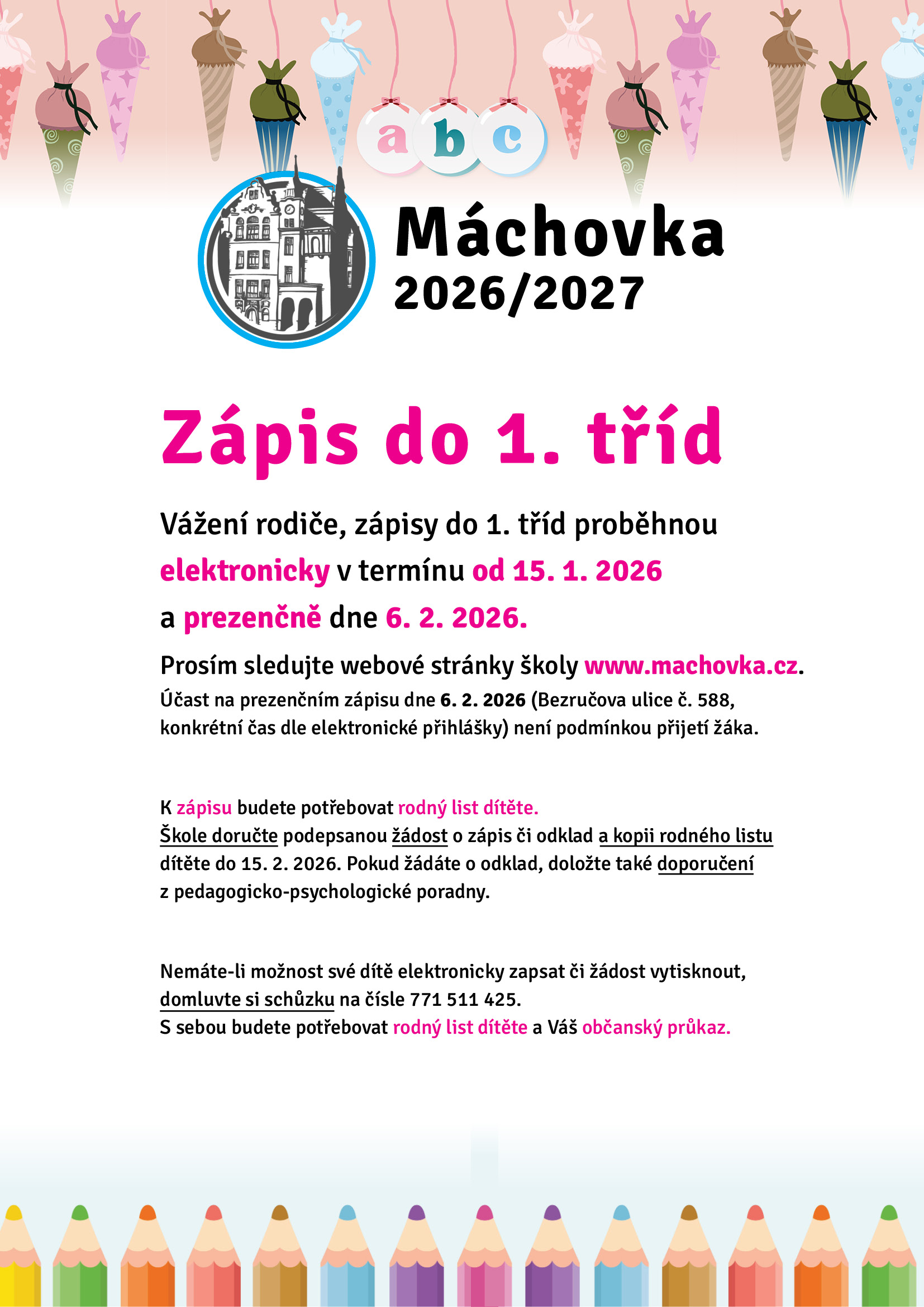 zápis do 1. tříd na školní rok 2026/2027 proběhne elektronicky v termínu od 15. 1. 2026 a prezenčně v pátek 6. 2. 2026.