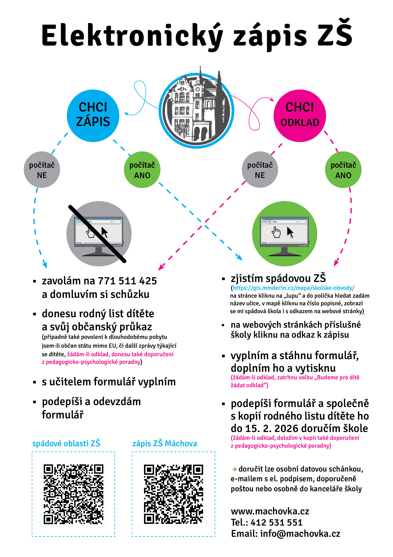 Nemáte-li možnost své dítě elektronicky zapsat či žádost vytisknout, domluvte si schůzku na čísle 771 511 425.