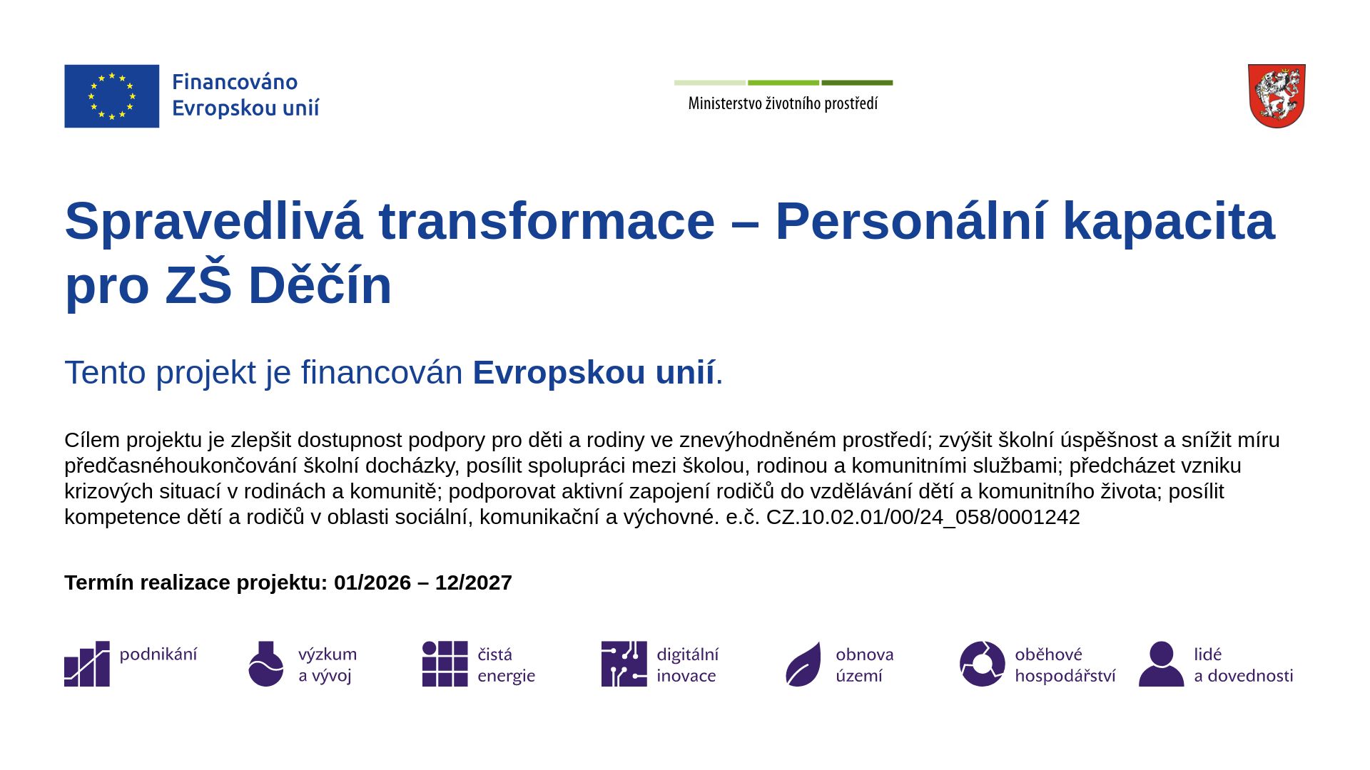 Cílem projektu je udržet a rozšířit systematický a koordinovaný přístup k základnímu vzdělávání ve školách zřizovaných městem Děčín, celkem 11 ZŠ. Jedná se o upevnění a systematické rozšíření proinkluzivních opatření a rozšíření o kariérové poradenství, které bude úzce pracovat právě s inkluzivními nástroji. Dalším cílem projektu je nově se v oblasti inkluze zaměřit i na mateřské školy. Projekt opět síťuje všechny mateřské školy zřizované městem Děčín, celkem 10 MŠ. Zde usilujeme o zlepšení práce s dětmi, které pocházejí ze sociálně, kulturně či ekonomicky znevýhodněného prostředí, též o zlepšení práce s rodiči dětí jak z takto znevýhodněného prostředí, tak i s rodiči majority, u nichž je potřeba pracovat s jejich předsudky. Projekt cílí na děti a žáky všech zúčastněných škol a jejich pedagogický personál.